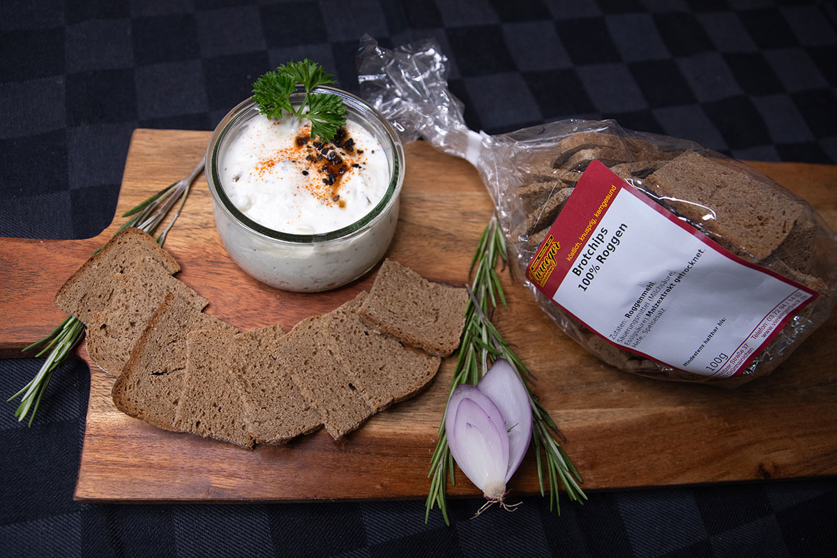 Diese Brotchips kommen von unserem 100% Roggenbrot. Das Brot wird erst in dünnen Scheiben geschnitten, danach zu Ecken. Anschließend werden die Stücken getrocknet.