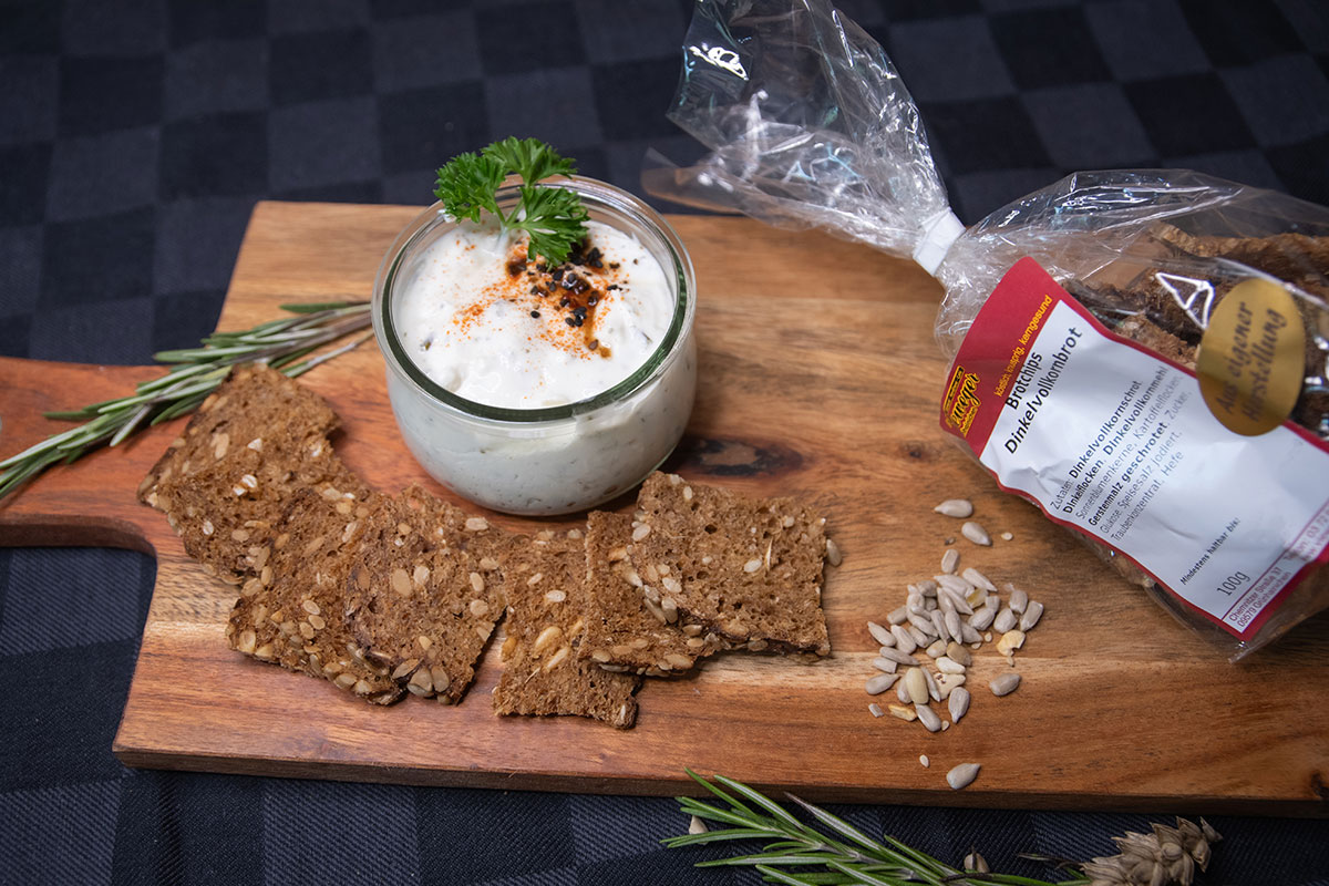 Diese Brotchips kommen von unserem Dinkelvollkornbrot. Das Brot wird erst in dünnen Scheiben geschnitten, danach zu Ecken. Anschließend werden die Stücken getrocknet.