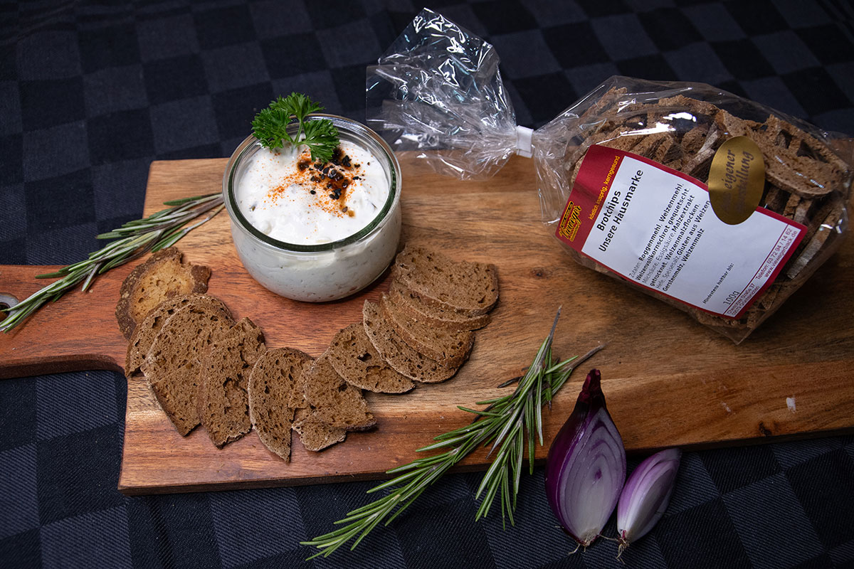 Diese Brotchips kommen von unserer Hausmarke. Das Brot wird erst in dünnen Scheiben geschnitten, danach zu Ecken. Anschließend werden die Stücken getrocknet.