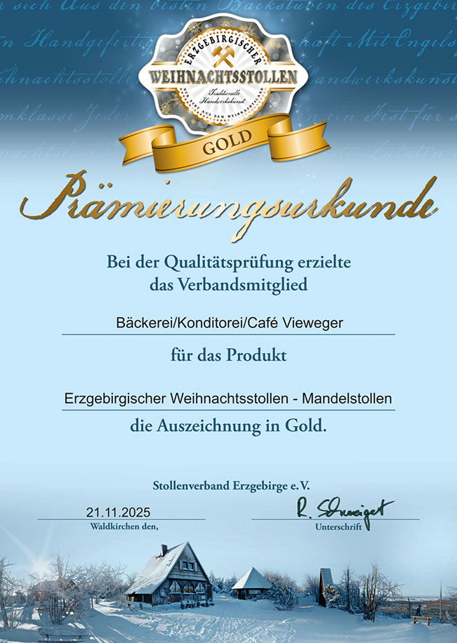 - Unser Mandelstollen wurde im Jahr 2025 vom Stollenverband Erzgebirge e.V. in Gold ausgezeichnet