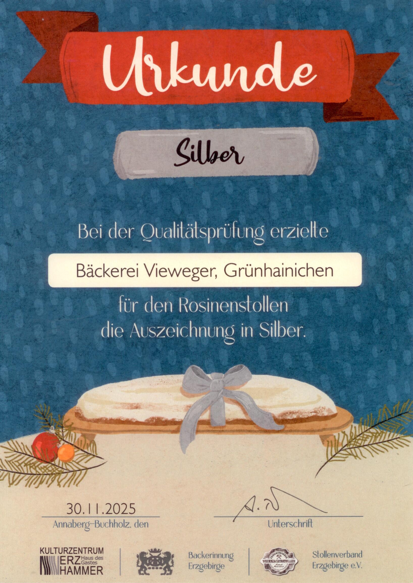 - Unser Rosinenstollen wurde im Jahr 2025 vom Stollenverband Erzgebirge e.V. in Silber ausgezeichnet